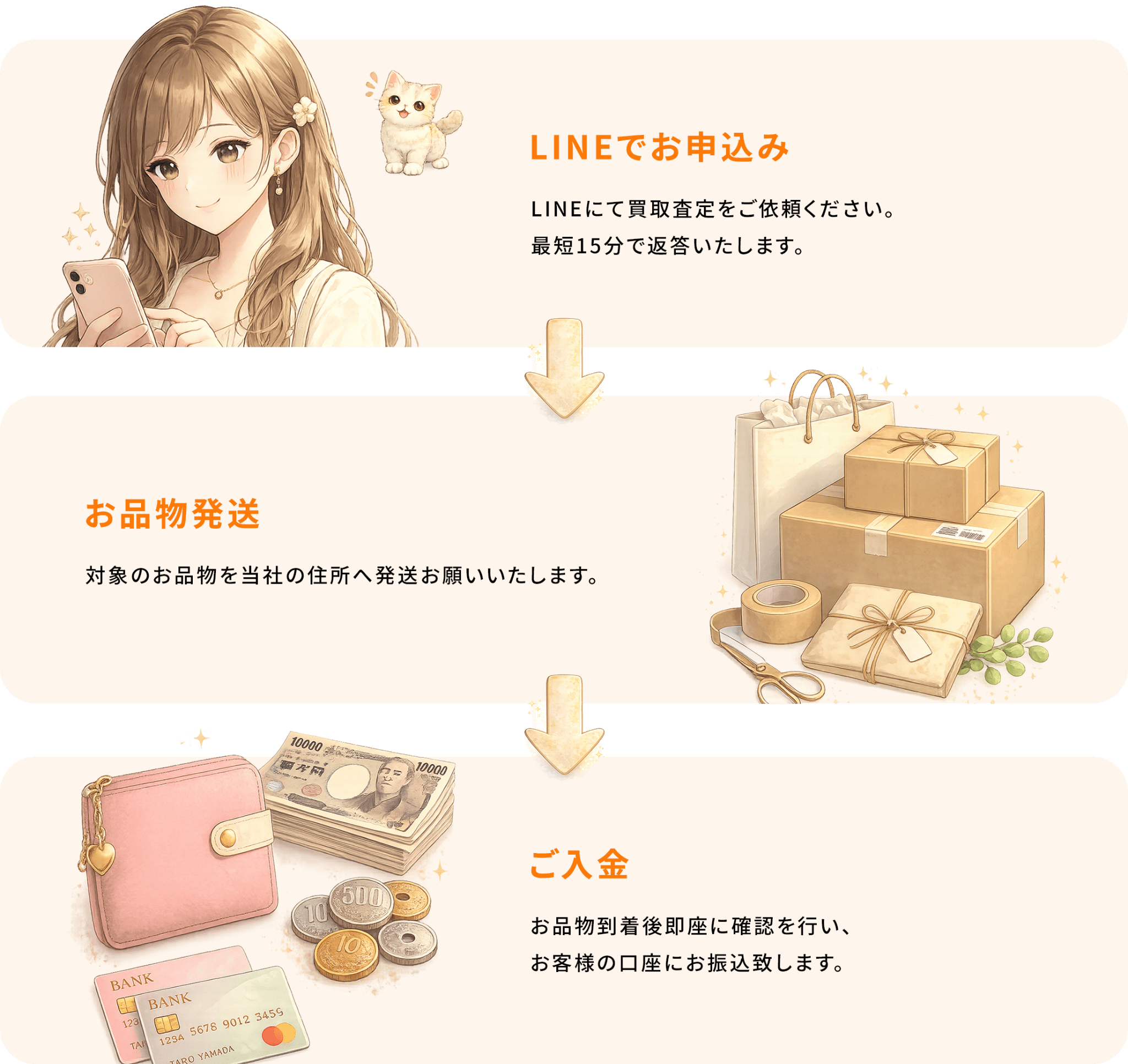 買取成立後は、ご郵送のみで手続きが完了し、確認次第、